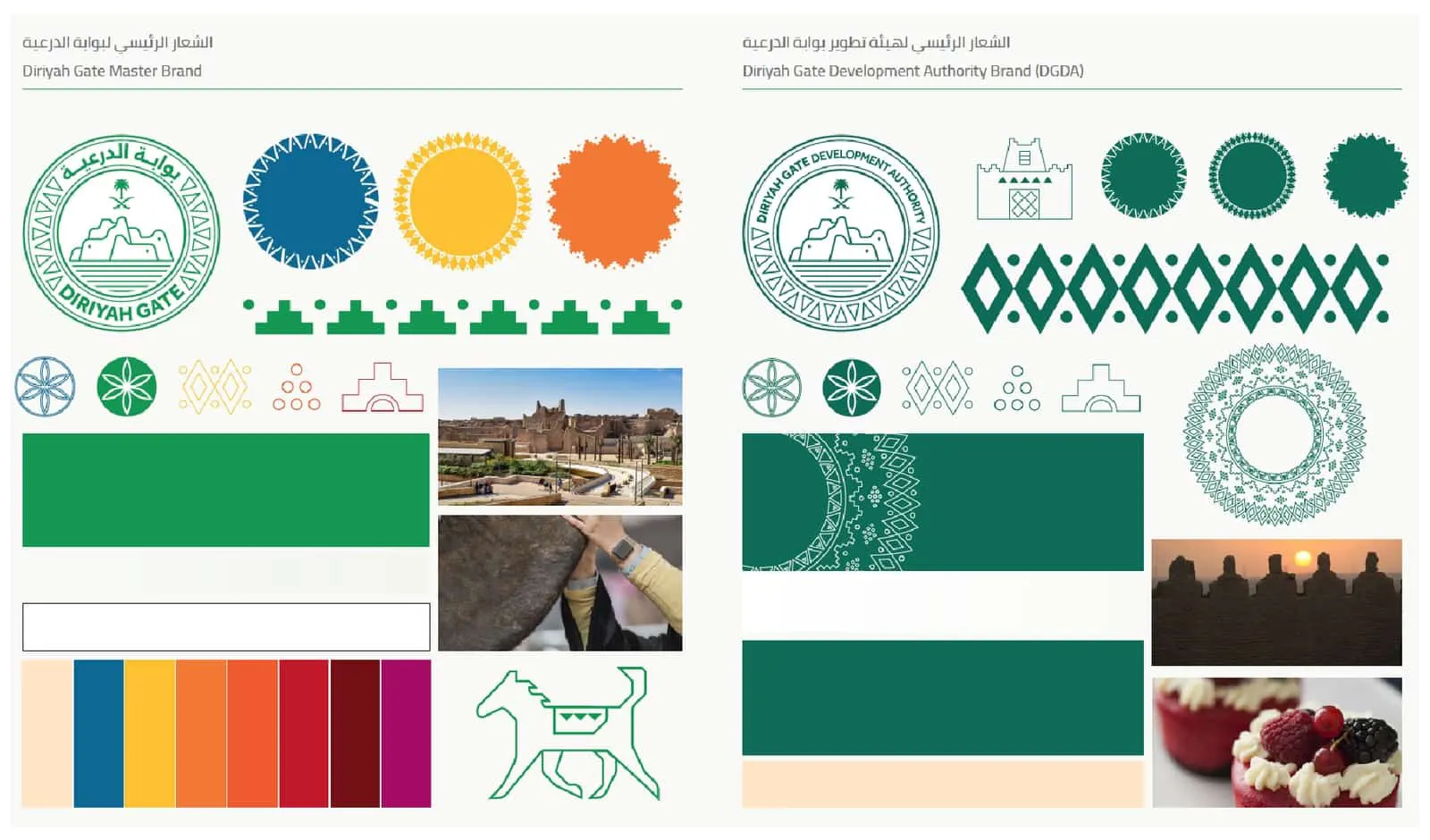 The duality of pride and happiness was at the heart of the DGDA brand, it was this feeling that the brand intended to evoke through its authentic experiences. The brand’s internal culture was guided by values of pride, being rooted in heritage, building connections, inclusivity, and authenticity. The logo was inspired by the silhouette of the outline of the historic Diriyah town. The logo was manifested in a color palette that borrowed from the geography of the destination, and icons that reflect the rich historic culture of the destination.